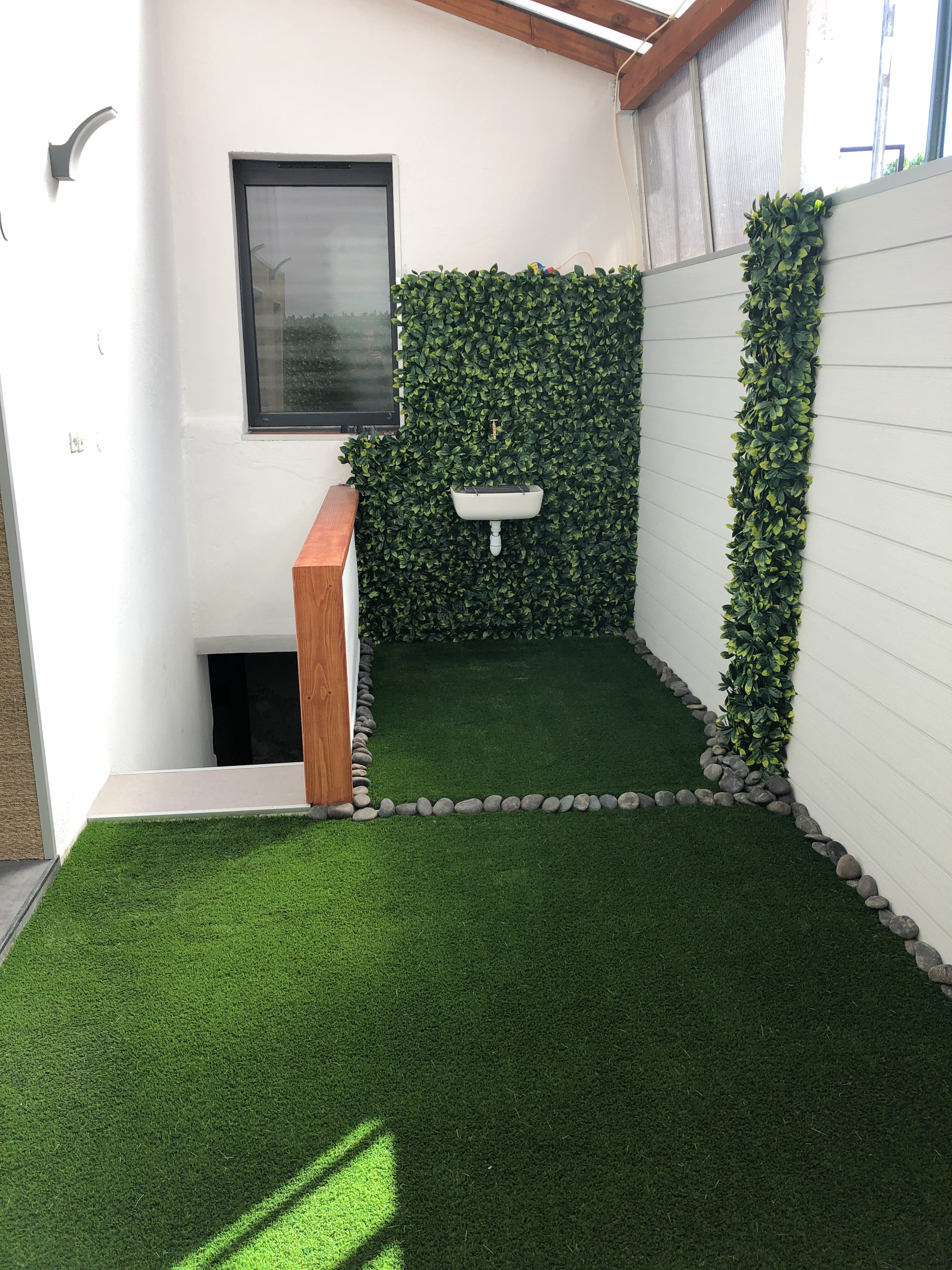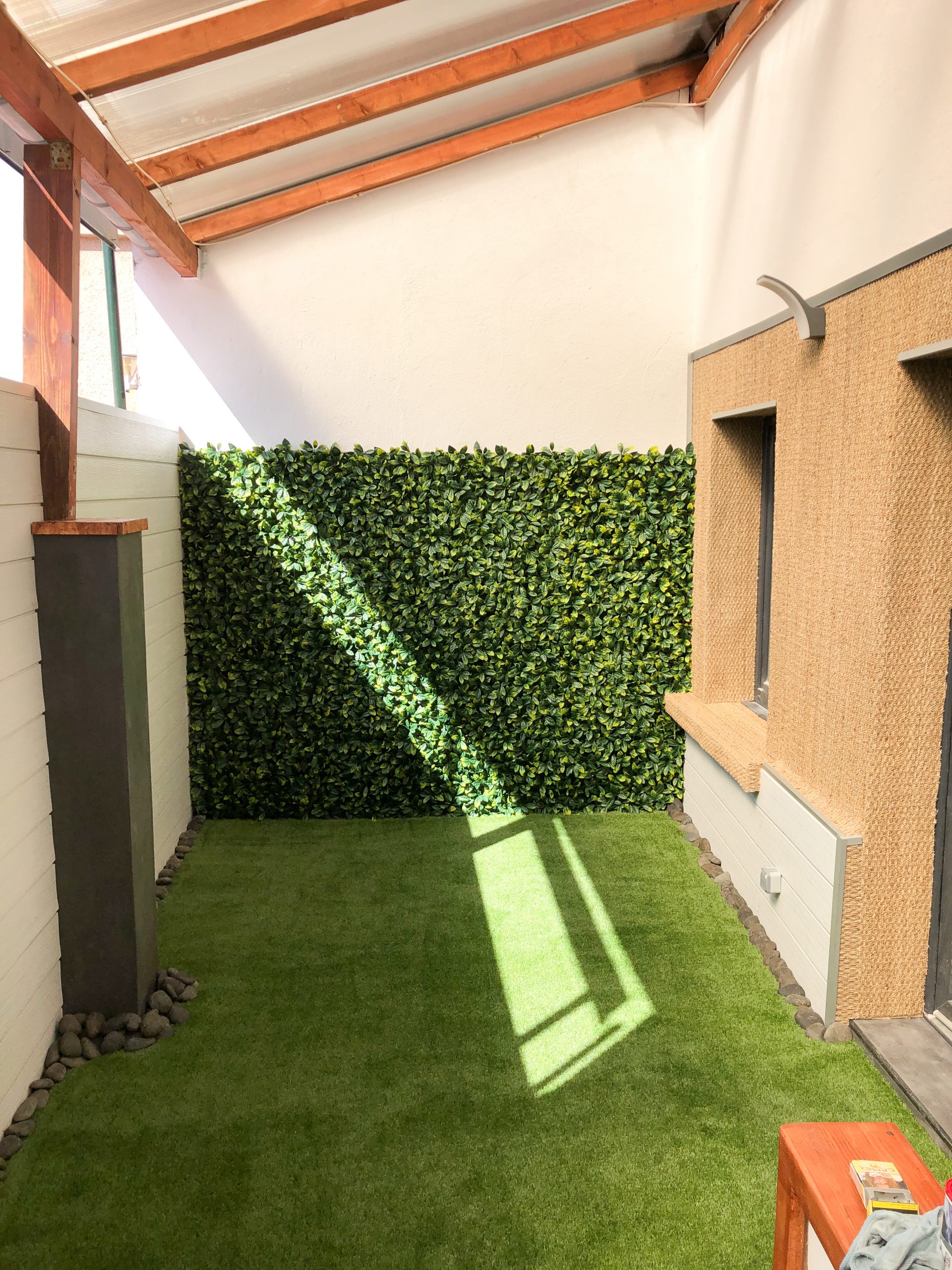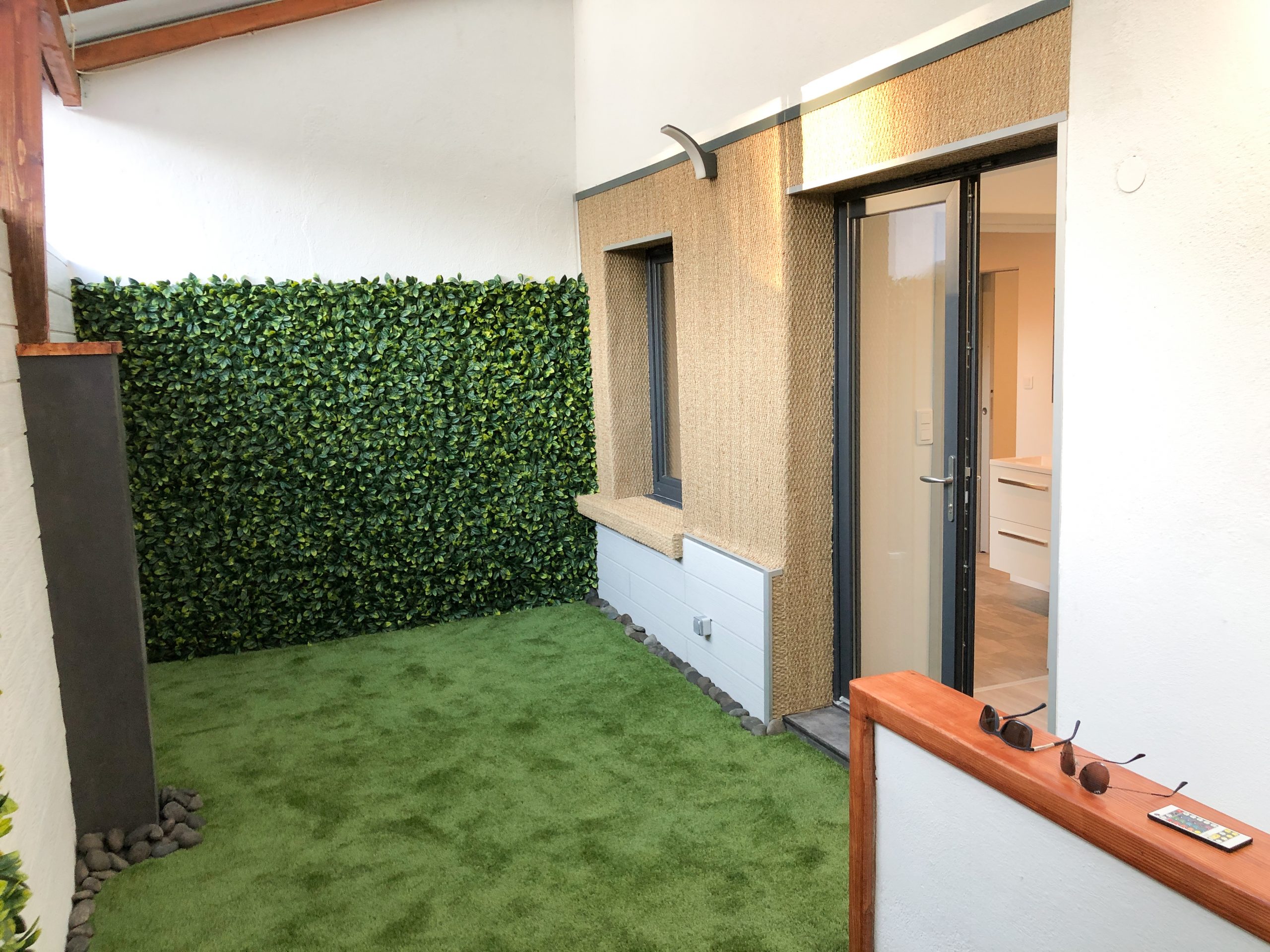 Installation de feuillage artificiel pour créer un espace vert attrayant et sans entretien.